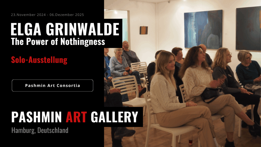 Einblicke in die Eröffnung von ‚The Power of Nothingness‘ – Elga Grinvalde Die abstrakten Werke der lettischen Künstlerin Elga Grinvalde begeisterten das Publikum mit ihrer feinen Balance aus Licht, Schatten und Leere. Ein spontaner Gesangsmoment während der Vernissage schuf eine besondere Verbindung zwischen Besuchern und Künstlerin.